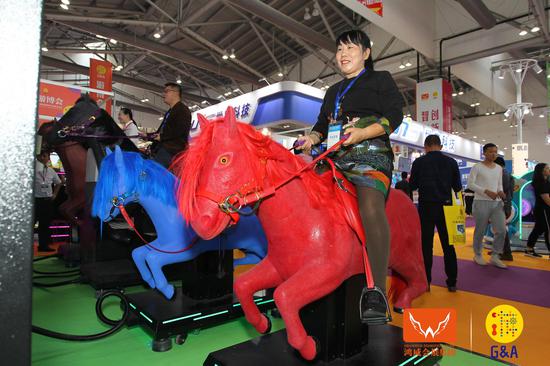 如金馬科技的GJT-60A觀景塔、ZB-72A轉轉杯、3D互動軌道車;世宇的動感戰機、怪獸獵人、一球成名、糖果扭扭蛋;華立的瘋狂兔子、頭文字D ZERO、巨獸浩劫2幸運光圈;大新的裝配式智能泳池;通利動漫:粉紅格格禮品機,海綿寶寶游樂設備;牧童的叢林水寨、皮筏滑梯、牧童繽紛水屋,日東的繽紛射球、旋風摩托;智跑的中型懸掛過山車、彈射過山車;金滿鴻的樂吧車、戰火金剛、幻影摩托;燁睿的一推天下、YOYO派對;兩只老虎的翻滾車、倉鼠球……
